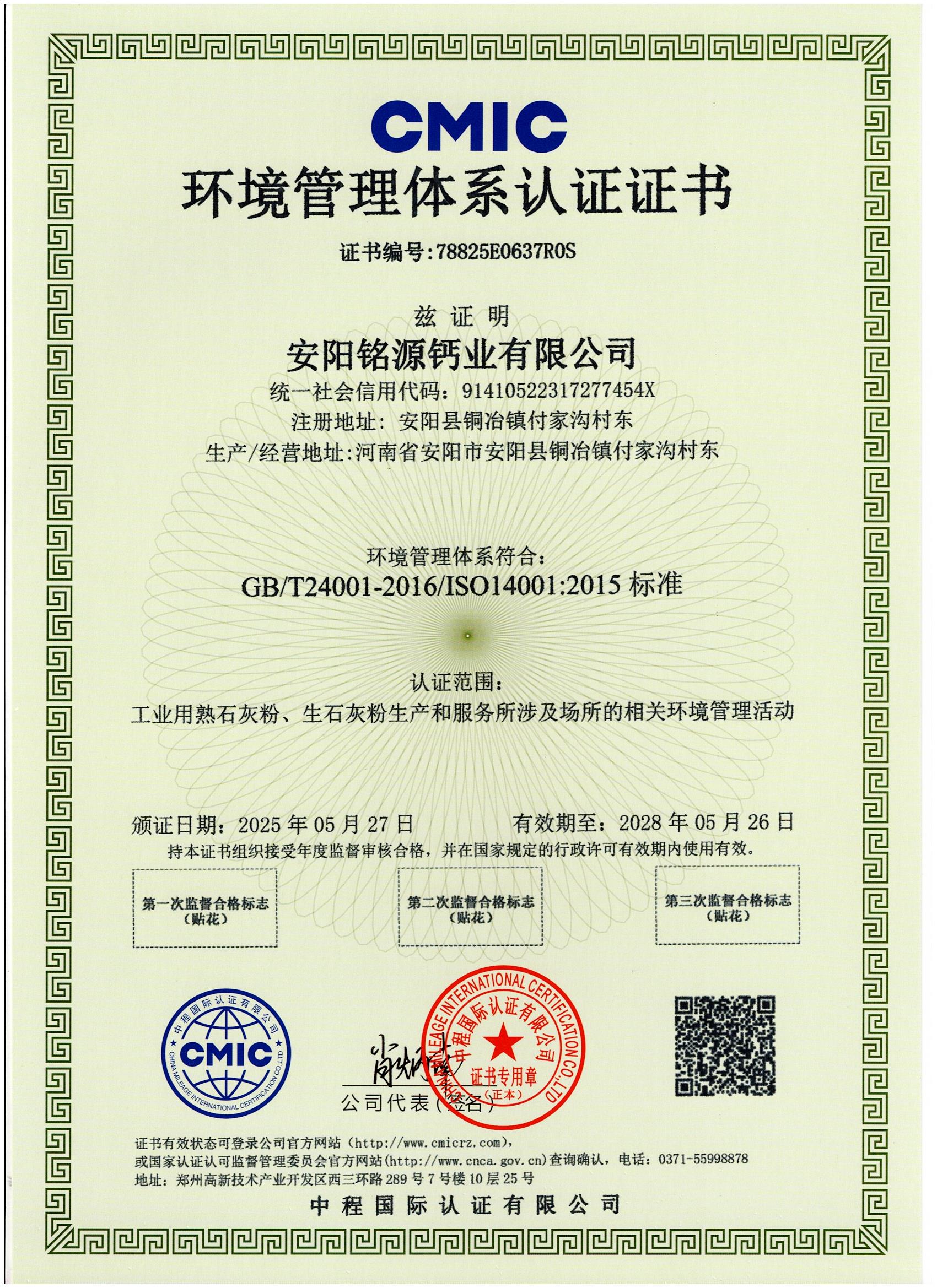 环境管理体系认证证书